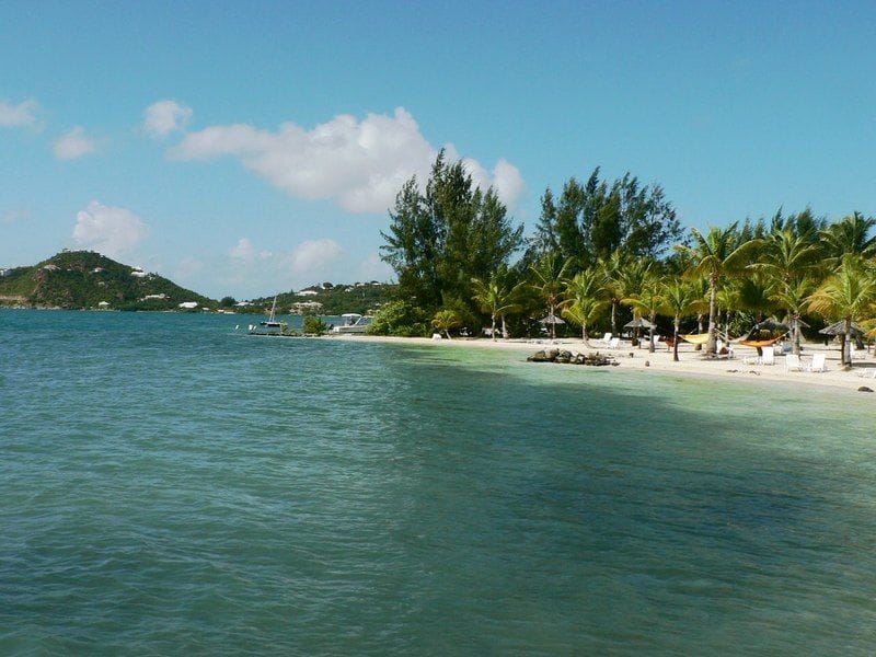 Baie Nettle (or in English Nettle Bay) is one of the more unusual pieces of geography on the French side — a narrow strip of land squeezed between Simpson Bay Lagoon to the east and the Caribbean Sea to the west, on the road between Simpson Bay and Marigot. Hotels and condominiums line both sides. The lagoon is on one side of the road, the ocean on the other, and in some places the strip is barely wide enough for both.